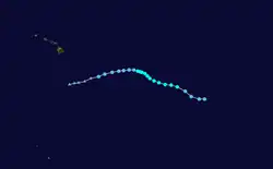 A tropical depression formed at 12:00 UTC on July 26 while positioned about 760 mi (1,220 km) south-southwest of Cabo San Lucas, Mexico from a tropical wave that entered the eastern Pacific nearly a week prior. The system quickly intensified as it curved west-northwest around a subtropical ridge, becoming Tropical Storm Darby at 00:00 UTC on July 27 and strengthening into a Category 1 hurricane early the next day. After attaining its peak as the season's first major hurricane with winds of 120 mph (190 km/h), increasing wind shear and cooler sea surface temperatures begin to weaken the cyclone. It weakened to a tropical storm at 12:00 UTC on July 30 and further to a tropical depression a day later as it entered the jurisdiction of the Central Pacific Hurricane Center.[12] At 12:00 UTC on August 1, Darby dissipated about 850 mi (1,370 km) east of the Hawaiian Islands.[18]