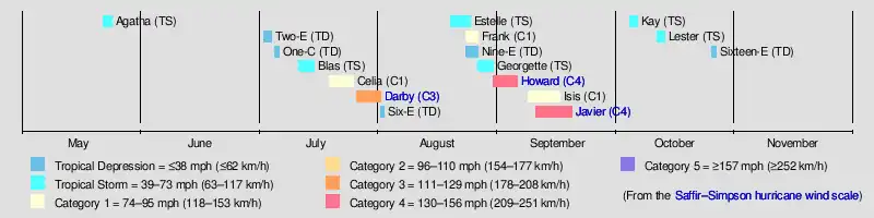 The season's first storm, Agatha, developed on May 22.[9] No tropical cyclones developed during June, below the average of 2 named storms and 1 hurricane, and also the first time since 1969 that the month was cyclone-free.[10] The first hurricane of the season was Celia, which briefly reached Category 1 strength on July 22.[11] It was soon followed by Darby, the first major Hurricane of the season and the first in the Eastern Pacific since Kenna in 2002.[12] Later, on September 14, Javier attained sustained winds of 150 mph (240 km/h), making it the strongest hurricane of the season.[13]