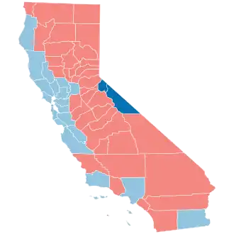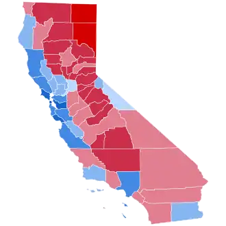 Bush remains the last Republican candidate to win San Diego, San Luis Obispo and Ventura counties in a presidential election. Fresno, Merced, Riverside, San Bernardino, San Joaquin, and Stanislaus counties would not vote Republican again until 2024. He is also the last candidate of any party to win Butte county by a majority. This is the last time the Democratic Party failed to obtain at least 60% of the vote until 2024.[9][10]