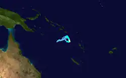 Late on November 16 a weak tropical disturbance formed to the north-west of Tuvalu embedded within the South Pacific Convergence Zone.[5][19] The disturbance did not have any organised convection near the low level circulation centre and was located in an area of low vertical wind shear.[19] Early the next day whilst the organisation of the system had not improved much, there had been enough of an increase in convection in the northern and southern quadrants for RSMC Nadi to designate the disturbance as Tropical Depression 04F.[20] Over the next couple of days the depression gradually moved towards the south-west before the low level circulation center was relocated to the north of Vanuatu early on November 19.[21][22] The depression continued to gradually develop, with a Tropical Cyclone Formation Alert being issued late on November 21 as convection had erupted about the low level circulation centre with bands of convection wrapping around the low level circulation significantly.[5][23][24][25]