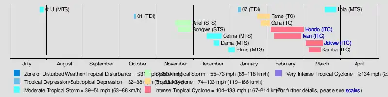 Early on December 30 an area of disturbed weather formed west of Madagascar and was designated as 06R.[55] Later that day it was upgraded to Tropical Disturbance 06R,[56] whilst the JTWC issued a TCFA on the developing system.[57] On December 31, Météo-France upgraded the disturbance to tropical depression status.[58] Soon after, the JTWC upgraded the system to Tropical Cyclone 09S.[59] Early on January 1, the depression was upgraded to Moderate Tropical Storm Elnus, while located in the Mozambique Channel.[60] On January 2, Météo-France downgraded the system to Tropical Depression ex-Elnus,[61] and then to a tropical disturbance the next day.[62] The JTWC issued its last advisory on January 4 as it transitioned to an extratropical system. Météo-France noted the storm was becoming extratropical on January 4,[63] and on January 6 issued its final advisory on Extratropical Depression ex-Elnus as the system passed to the south of Madagascar.[64]