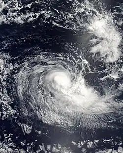 Roughly six hours later, the JTWC assessed Lee–Ariel to have reached its peak intensity with winds of 110 km/h (68 mph) 1-minute sustained),[17] based on the development of an eye-like structure.[18] The next day, foreword motion slowed significantly due to a subtropical ridge located to the north of the storm. This ridge also caused the storm to turn towards the west, keeping a slow pace.[19] Strong wind shear began to impact the system later that day, causing it to weaken into a moderate tropical storm. Despite the strong shear, most forecast models showed the storm re-intensifying several days out in an area of lower shear.[20] Most of the deep convection was torn away from the system, with little remaining around the center of circulation.[21]