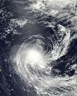 On November 13, the Australian Bureau of Meteorology (BoM) began monitoring a tropical low situated about 835 km (519 mi) northwest of the Keeling Islands.[11] The next day, the low was upgraded to a Category 1 cyclone and given the name Lee.[12] Shortly after being named, the JTWC issued a TCFA as deep convection persisted around the center of circulation. The system was moving towards the southwest within an area of moderate wind shear.[13] Several hours later, the JTWC designated Lee as Tropical Cyclone 03S.[14] With continued development, Lee strengthened into a Category 2 cyclone, according to the BoM, with winds of 95 km/h (59 mph) 10-minute winds).[15] At 1200 UTC, Lee crossed into Météo-France's area of responsibility at peak intensity. Upon entering their AoR, it was given a second name, Ariel, and designated as a severe tropical storm.[16]