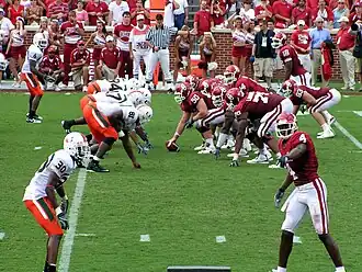 On July 19, a preseason poll voted on by members of the media that cover the Big 12 was released. The Sooners were chosen to finish second in the Big 12 South behind Texas. They finished nine votes behind the Longhorns but 44 points above Texas A&M, the third team.[1] This poll was released in anticipation of the Big 12 media day which began on July 23, 2007. Most publications had the Sooners ranked between five and ten in the preseason.[2][3][4][5] Phil Steele's self-titled publication, which is considered by many to be the most accurate college football preseason prediction magazine,[6] had the Sooners ranked number three in terms of how they would finish the year and how strong the team is going into the year.[7] On August 2, 2007, Coach Bob Stoops announced at a rally that the names of players would be put back on the team's jerseys. They had been removed in a re-design before the 2006 season.[8]