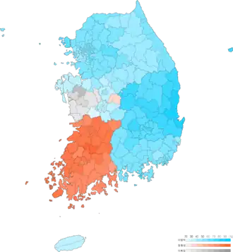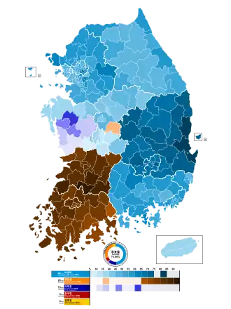 | South Jeolla | 2,692 | 57.0 | 1,852 | 39.2 | 133 | 2.8 | 48 | 1.0 | 4,725 |