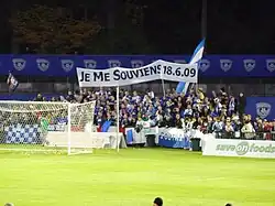 The Southsiders, a Whitecaps supporters group, with a Je me souviens banner referencing the events of June 18, 2009 during a match against the Impact on October 10, 2009.