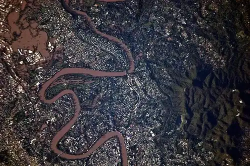 With the flood peaking at 4.46 metres (14.6 ft) in Brisbane City, the flood level was about the tenth-highest in the city's history, several metres below the 1890 flood and the two major floods in 1893.[61][65] Some unique field measurements about the peak of the floods showed very substantial sediment fluxes in the Brisbane River flood plains consistent with the murky appearance of floodwaters.[66][67] The field deployment showed also some unusual features of flood flow in an urban environment linked with some local topographic effects. Parts of the western suburbs of Brisbane were cut off for three days. Resident of suburbs including Bellbowrie, Karana Downs, Moggill and Pullenvale were running low on food and other items when Moggill Road was cut, until the Australian Army was able to reach the area on 15 January with supplies.[68]