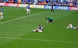 Cardiff kicked off the match around 3 p.m. in front of a Wembley Stadium crowd of 82,244.[36][37] They began as the more attacking of the teams, with Peter Whittingham playing a cross into the box where Chopra was able to beat opposition defender Alex Baptiste to the ball, hitting the crossbar with his resulting shot four minutes into the match.[37][38] Five minutes later, Whittingham again played in Chopra, allowing the striker to score past Blackpool goalkeeper Matt Gilks into the bottom corner of the net. Four minutes later Cardiff conceded a free kick on the edge of their penalty area when Stephen McPhail was adjudged by Marriner to have deliberately handled the ball. Adam hit the free kick around the wall and into the net to equalise. After fifteen minutes Cardiff's Bothroyd succumbed to his pre-existing hamstring injury and was substituted,[26] being replaced by loan player Kelvin Etuhu. Blackpool were able to gain control of the game as Cardiff adjusted to the change,[26] with both Stephen Crainey and DJ Campbell shooting wide from outside the penalty area.[30]