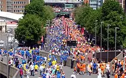 Cardiff City fans (blue) and Blackpool fans (tangerine) make their way to the stadium along Wembley Way
