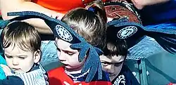 Two Ranger fans wearing their "antlers" to an October game