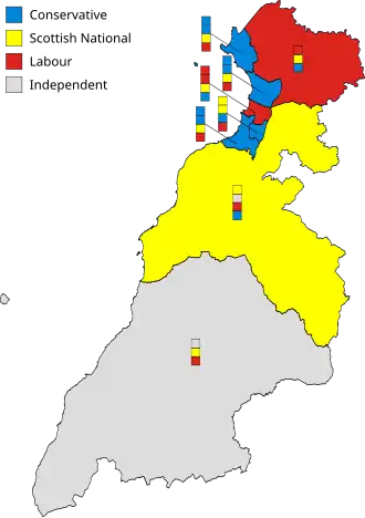 The election saw the Conservatives remain as the largest party on the council despite losing two seats. The Scottish National Party (SNP) gained one seat and were second on the popular vote as they tied with Labour as the second largest party. Labour retained their nine seats despite their vote share decreasing by 3.4% and after suffering three defections during the last term. The number of independent candidates elected doubled to two seats.