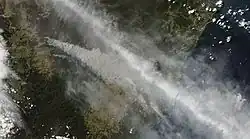 Just after midday on 17 January, a fire ignited from a rekindle of a lightning strike in the Eden Valley. The fire spread under the influence of strong north-westerly winds and then an intense southerly wind change, with gusts over 120 km/h (75 mph), pushed the fire northwards.[20] During a 16-day period, the fire burned 25,000 ha (62,000 acres) of scrub, forest and pasture and impacted the communities of Angaston, Cambrai, Keyneton, Sedan, Springton and Truro; 4 houses and significant quantities of feed, water and fencing were destroyed.[20][30]