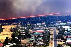 The most serious fire to start during the day ignited when a tree fell on a powerline along Mickleham Rd., Mickelham.[73] The fire spread rapidly north and threatened 1,240 houses and 13,000 residents within the eventual footprint of the fire. At least 810 firefighters, supported by 15 aircraft, battled to contain the fire as it crossed the boundaries of 3 local government areas, and on 14 February the fire was declared under control.[31] During a 23-day period, the fire burned 22,877 ha (56,530 acres) of scrub, forest and private property and impacted the communities of Beveridge, Bylands, Chintin, Craigieburn, Darraweit Guim, Donnybrook, Kalkallo, Kilmore, Mickleham, Moranding & Wallan; 18 houses, numerous non-residential buildings, 1,600 km (990 mi) of fencing and 9,000 ha (22,000 acres) of pasture and horticulture were destroyed by the fire and at least 16,000 head of livestock died during the blaze and after.[22][31]