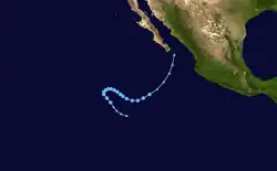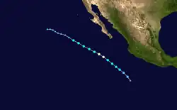 A tropical wave emerged off the western coast of Africa on June 17, tracking across the Atlantic Ocean with inappreciable organization throughout the following days. The wave crossed Central America on June 25, where deep convective activity increased. On June 28, the disturbance became distinctively better defined with a well-defined center and spiral banding, signifying the formation of a tropical depression by 18:00 UTC while positioned about 345 mi (555 km) south-southwest of Manzanillo, Mexico. Steered west-northwest and eventually northwest under the influence of a mid-level ridge, the broad cyclone slowly intensified into a tropical storm by 00:00 UTC on June 30, attaining peak winds of 50 mph (80 km/h) late the next day. Thereafter, a track over cooler waters and into a drier environment caused the system to begin weakening; at 06:00 UTC on July 5, Douglas degenerated into a non-convective remnant low well west of Baja California. The remnant low turned slowly west-northwest prior to dissipating on July 8.[39]