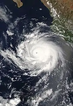 Continued, though less prolific, activity extended through September with four hurricanes developing that month. ACE values remained 45% above-average by the end of the month.[16] Following the rapid intensification of Hurricane Simon to a Category 3 hurricane during the afternoon of October 4, the 2014 season featured the highest number of major hurricanes in the Eastern Pacific basin since the advent of satellite imagery. With eight such storms east of 140°W, the year tied with the record set in the 1992 season.[17][18] However, this record was surpassed by the 2015 Pacific hurricane season.