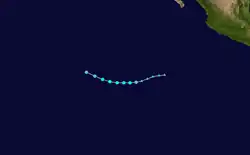 A well-defined tropical wave moved emerged off the western coast Africa on June 20. After entering the East Pacific a week later, shower and thunderstorm activity began to increase. Although the system lacked a closed low initially, a small circulation was noted by 06:00 UTC on June 30, and the system was declared Tropical Storm Elida accordingly. Paralleling the southwestern coast of Mexico, the cyclone attained peak winds of 45 mph (70 km/h) before strong northwesterly wind shear from nearby Tropical Storm Douglas caused the storm to become disheveled. It weakened to a tropical depression at 00:00 UTC on July 2 and degenerated into a remnant low six hours later. The remnant low drifted southeastward before dissipating early on July 3.[40]