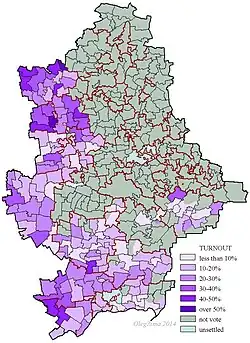 On 17 May 2014, the Central Election Commission of Ukraine (CEC) stated that, due to "illegal actions of unknown people", it could not arrange for the "preparation and conduct of elections" in six constituencies in the Donetsk and Luhansk Oblasts.[47] According to the CEC, members of district election commissions there had received threats to their own personal safety and to that of their families.[47] The CEC warned that two million people in the two oblasts (provinces), about 5.6% of Ukraine's approximately 36 million eligible voters, could be deprived of their right to vote if the situation there did not improve.[47][d][e] On 22 May, the work of eighteen of the thirty-four election commissions in Donetsk[f] and Luhansk Oblasts had been stopped fully or partially by representatives of the self-proclaimed Donetsk People's Republic and Luhansk People's Republic.[49] By 23 May, this number had increased to twenty of the thirty-four.[50] The Committee of Voters of Ukraine predicted on 23 May that, due to "ongoing acts of terrorism and armed insurgency", 10% of the Ukrainian population would be unable to vote.[51][g] On the same day, the leader of the Luhansk People's Republic advised citizens not to go to the polls to vote, warning of possible provocative "explosions" set by Ukrainian military.[52]