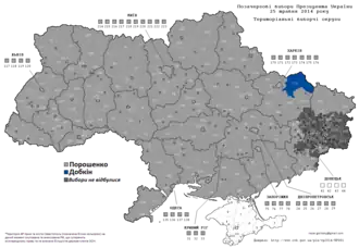 Petro Poroshenko won the elections with 55% of the vote.[4] His closest competitor was Yulia Tymoshenko, who emerged with 13% of the votes.[4] The Central Election Commission reported voter turnout at 60% excluding those regions not under government control.[6][7] In the Donbas region of Ukraine only 20% of the ballot stations were open due to threats and violence by pro-Russia separatists.[13] Of the 2,430 planned ballot stations (in Donbas) only 426 remained open for polling.[13]