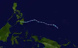 A day after Bavi dissipated, a low-pressure area formed southwest of the Marshall Islands. It slowly drifted northwestward and became more organized over the next two days.[69] The next day, the JMA started tracking the system as a tropical depression.[70] On March 27, the JTWC started tracking the system as a tropical depression, and designated it 04W.[71] Moving west-northwestward, the system's center became more consolidated with convective banding becoming wrapped into it. The JTWC upgraded 04W to a tropical storm the same day.[72] The JMA followed suit later that day, when it was named Maysak.[73] On March 28, Maysak developed an eye,[74] and the JMA further upgraded it to a severe tropical storm.[75] The eye became more well defined with deep convection persisting along the southern quadrant of the storm. The overcast became more consolidated,[76] as the JMA upgraded Maysak to a typhoon on the same day.[77] On March 29, Maysak rapidly intensified over a period of 6 hours, attaining 1-min maximum sustained winds of 230 km/h (145 mph), making it a Category 4 equivalent on the SSHWS.[78] On the next day, Maysak further intensified into a Category 5-equivalent super typhoon. On April 1, the PAGASA stated tracking on the system, naming it as Chedeng. Typhoon Chedeng (Maysak) weakened more and eventually dissipated in the Luzon landmass. The remnants of Maysak eventually made it to the South China Sea.[79]