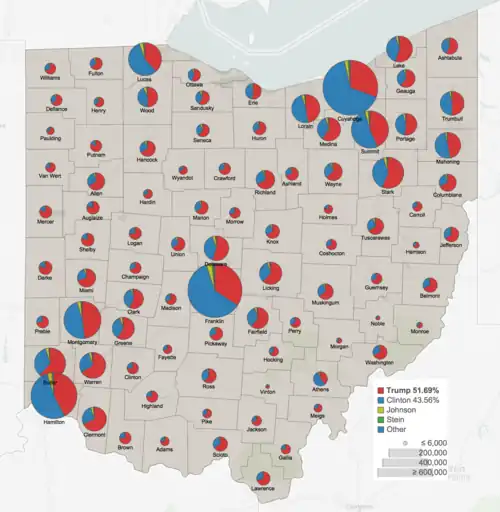 This was the first time since 1988 that Erie, Montgomery, and Portage counties voted for a Republican presidential candidate. Ashtabula County did so for the first time since 1984, and Trumbull County since 1972.[46] This is the last election in which Montgomery County voted for the Republican candidate, and the last in which Lorain and Mahoning County voted for the Democratic candidate.