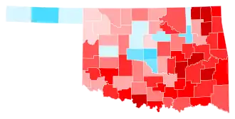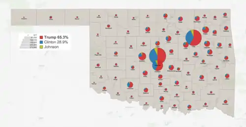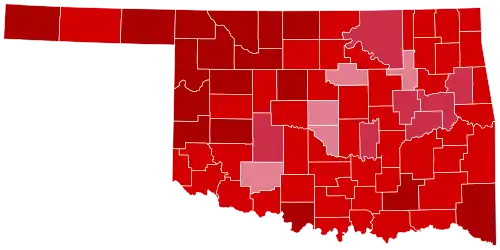 Oklahoma has been a Republican-leaning state since 1952, and a Republican stronghold since 1980. Trump subsequently carried the state with 65.3% of the vote, while Clinton received 28.9%.[3] Considered a safe Republican state, Oklahoma has voted Republican in fifteen of the last sixteen elections. It was also one of two states where Trump won every county, the other being West Virginia. This also marked the fourth consecutive election in which the Republican candidate carried every county in the state.[4]