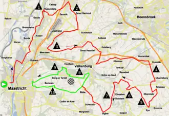 The race started on Maastricht's Markt, the city's central market square, and finished in Berg en Terblijt, covering 116.9 km. The route was made up of one bigger loop in the south of Limburg, followed by three 18 km loops centering around Valkenburg which featured the Geulhemmerberg, Bemelerberg and Cauberg climbs. In total, the route contained 17 categorized hills, usually short but with a varying gradient and coming in quick succession throughout the race.[1] The Cauberg, the most difficult and iconic passage, was addressed four times; once more than during the men's race. The fourth crossing of the Cauberg was also the last climb of the day. From the top, there was a 1.7 km run-in to the finish line in Berg en Terblijt.[3]