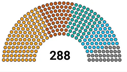 The Maharashtra Legislative Assembly has 288 seats. In the 2019 election, the Bharatiya Janata Party (BJP) won 105 seats, Shiv Sena won 56, the Nationalist Congress Party (NCP) won 54, and the Indian National Congress (INC) won 44. All India Majlis-e-Ittehadul Muslimeen (AIMIM) and Samajwadi Party (SP) won two seats each while Maharashtra Navnirman Sena (MNS) and the Communist Party of India (Marxist) (CPI (M)) won one seat each. 23 seats were won by other parties and independents. 145 seats are required for a majority to form government.[5]