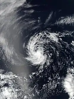 The interaction between a tropical wave, a preexisting area of disturbed weather, and the favorable phase of the Madden-Julian Oscillation (MJO) led to the formation of a surface low late on June 23. Deep convection coalesced with this circulation over the ensuing hours, and a tropical depression developed around 06:00 UTC on June 24. The system struggled via the effects of nearby dry air and some wind shear as it moved west to west-northwest under the subtropical ridge. Nonetheless, it intensified into Tropical Storm Boris around 18:00 UTC on June 25 when deep convection was most prevalent. A further increase in upper-level winds prevented Boris from strengthening beyond minimal tropical storm intensity, and it instead weakened to a tropical depression again twelve hours later before crossing into the Central Pacific basin. All associated thunderstorm activity dissipated by June 28, and Boris degenerated to a remnant area of low pressure by 00:00 UTC that day. The post-tropical cyclone curved west-southwest and dissipated well south-southeast of the Hawaiian Islands on June 30.[26]