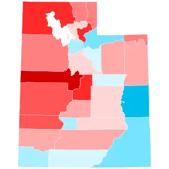 In 2020, Trump won Utah with 58.1% of the vote and a margin of 20.5%, which although an improvement on his 18.1% margin over Hillary Clinton in 2016, is still relatively narrow compared to the performance of past Republican nominees. He performed strongly in rural areas, as well as in some larger counties like Utah (Provo), Davis (Farmington), and Weber (Ogden). Trump improved over his 45.5% plurality win in 2016, due in part to the lack of a strong third-party presence, as Evan McMullin had earned 21.5% of the vote in 2016 but did not run in 2020; he endorsed Biden.[4][5] The election was far more of a two-party contest in 2020, with third parties receiving 4.2% of the vote, compared to 27% in 2016. Despite this, the Associated Press reported a less partisan and more cooperative cultural environment in Utah compared to other states during the election.[6]