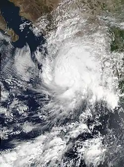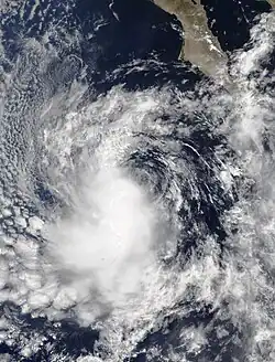 On July 26, the NHC noted a disturbance located about 700 miles (1,125 km) south-southwest of the southern tip of Baja California. The system moved parallel to another disturbance which later became Hurricane Hilda.[50] By 21:00 UTC on July 30, the disturbance attained a well-defined center of circulation with sufficient organized convection and was classified as a tropical depression, bearing the designation Nine-E.[51] The depression was initially forecast to become a tropical storm, but failed to do so due to dry air and wind shear caused by nearby Hurricane Hilda. Early on August 1, the system degenerated into a remnant low.[52] Even though Nine-E was a tropical low, the NHC still monitored the system for further development[53] On August 4, it re-intensified into a tropical depression again while maintaining two rainbands in a slightly elongated circulation.[54] On the next day, at 09:00 UTC, the depression intensified into a tropical storm, with the NHC naming it as Jimena, as the storm's deep convection had increased near the low-level center and based on satellite imagery, the storm was producing tropical storm force winds.[55] The convection later diminished on August 6, as it moved over cooler sea-surface temperatures and encountering high wind shear and dry airmass. However, despite all this, Jimena managed its intensity, as it continued to produce tropical storm force winds, based on ASCAT data.[56] A deep convective mass also continued to persist over the center of Jimena.[57] At 21:00 UTC, the NHC issued its last advisory, downgrading the system to a tropical depression as it entered the CPHC's area of responsibility. Its deep convection weakened significantly as it moved over cool sea surface temperatures causing Jimena to weaken.[58] The CPHC later issued its only bulletin for Jimena at 03:00 UTC the next day, stating that Jimena had become a post-tropical cyclone as its deep convection had collapsed completely.[59]