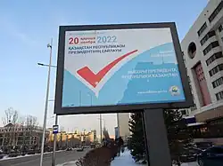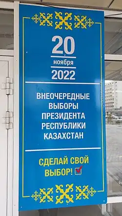 384. ^ Seilkhanov, Adlet (15 November 2022). "Up to 11mln Kazakhstanis can cast their ballots in upcoming presidential elections". Kazinform. Retrieved 20 November 2022.