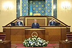 On 12 September 2022, President Tokayev under the proposals made by Jaña Qazaqstan legislators then appealed to the Constitutional Council to overlook the amendment draft in extending his term of office.[171] In response, the Constitutional Council ruled in favour of Tokayev's request on 13 September, thus setting the stage for the Parliament's approval.[172] On 16 September, at the joint session of the Parliament, several amendments including one seven-year presidential term were adopted.[173] Deputy Aidos Sarym described the decision as "a democratic norm", outlining that a new president of Kazakhstan will be chosen every seven years.[174] Deputy Erlan Sairov called it the "real direction of democracy" where "one political person cannot run for the presidency for more than one term."[175] Aq Jol Democratic Party deputy Qazybek Isa stressed that the move would prevent "some mistakes that have occurred" within the 30 years of Kazakhstan's independence, expressing his relief for the country having a "second president" and that a new president will take office in seven years.[176] The ratified constitutional amendments were subsequently signed into law by Tokayev on 17 September.[177][178][179]