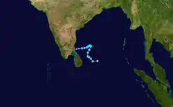 On 22 December, the JTWC began tracking a disturbance near Sumatra. It traveled westward before conducting an anticyclonic loop. It traveled north, then west, then north again. By this time, the IMD had already recognized it as a Depression, designating it as BOB 10, while the JTWC designated it as Invest 98B. The JTWC and the IMD assessed BOB 10 and gave it a low chance to develop into a tropical cyclone due to a broad LLC (Low Level Circulation) partially exposed to the southeast of flaring convection that is being sheared to the northwest, and marginally favorable environment.[133] On 25 December, the system weakened further as it approaches the coast of India being a remnant low. The JTWC was still tracking the system, and it made landfall in Northeastern Sri Lanka. The JTWC still gave it a low chance for tropical development, while the IMD said it couldn't develop further.[134] The storm continued to weaken and dissipated southwest of Sri Lanka on 27 December.