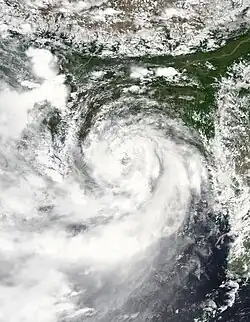 A fresh cyclonic circulation developed on early 19 May, over the Gulf of Martaban, due to the enhancement of the annual South-West monsoon over the basin.[44][45] By the evening, under the influence of that circulation, a low pressure system spawned over the same region.[45] At 18:00 UTC (23:30 IST), the JTWC also acknowledged that same circulation at the night of the same day.[46] By 00:30 UTC (06:00 IST) the JTWC published its TCFA for the system after it had rapidly consolidated its convective structure for the past few hours, and also formed a well-defined low-level center.[47] But eight hours later, the JTWC, cancelled it because its close proximity over land.[48] However, according to IMD, it rapidly consolidated into a well-marked low pressure area in the morning of the same day, and further into a depression at 11:30 IST (03:00 UTC), as it moved northeastwards, towards the south Burmese coast.[45] Between 08:00 UTC (13:30 IST) and 09:00 UTC (14:30 IST), the system made landfall over the southern Burmese coast, 30 km (20 mi) from Mawlamyine.[49] The system maintained its depression status as it travelled inland.[50][51] By 00:00 UTC (05:30 IST) the next day, the system finally weakened into a well-marked low pressure area over the Burma-Thailand.[52]