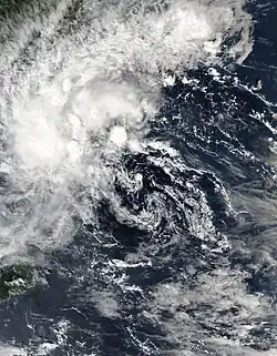 Towards the end of February, a cyclonic circulation formed over the Strait of Malacca and the adjoining Andaman Sea,[6] which later intensified into a low pressure area on midday (17:30 IST) of 28 February, as the disturbance formed a low-level circulation, according to a INSAT-3D satellite imagery.[7][8] Early the next day, at 09:00 UTC (14:30 IST), the disturbance further intensified into a well-marked low pressure area, as it developed a defined cyclonic vortex,[9] and three-and-a-half-hour later, the United States-based Joint Typhoon Warning Center (JTWC) started monitoring the same disturbance as Invest 90B.[10] On 3 March of midnight (05:30 IST), the well-marked low organized to a depression and the India Meteorological Department (IMD) identified the system as BOB 01, making it the first system of the season.[2] This intensification was possible because of a favourable Madden–Julian oscillation (MJO) phase, along with a feeble easterlies outflow. Additionally, sea surface temperatures (SST) of 27–28 °C (81–82 °F) were warm enough for tropical cyclogenesis to take place, along with moderate to high vertical wind shear.[2] During the next day, the JTWC issued a Tropical Cyclone Formation Alert (TCFA) on the system.[11] The depression subsequently intensified into a deep depression,[3] and by 21:00 UTC (02:30 IST), the JTWC started initiating advisories for Tropical Cyclone 01B.[12] After maintaining its intensity for a day, the JTWC issued its last warning for the system, at 15:00 UTC (20:30 IST) as the increasing dry air had weakened its convective mass.[13] The IMD subsequently weakened back to a depression due to the same reason.[14] On 6 March, the IMD issued its last advisory for the system and downgraded it to a well-marked low pressure area, as its convective mass got further disorganized by the wind shear.[4]