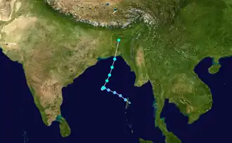 On 17 August, the JTWC recognized a newly formed low level circulation near Myanmar and designated it Invest 99B, which showed disorganized convective structure and an obscure low-level center.[79] By the next day, it developed into a low pressure area over northeastern Bay of Bengal and adjoining Bangladesh coast.[80] The JTWC unofficially released a TCFA for the system after its rapid development of its convective structure.[81] By the same day, at 21:00 UTC (02:30 IST), the JTWC unofficially declared it Tropical Cyclone 04B.[82] The IMD followed the same, and upgraded it to Depression BOB 06.[83] At 06:00 UTC (11:30 IST) on 19 August, BOB 06 further organized into a deep depression just off the coast of West Bengal and Bangladesh.[84] Shortly after intensifying, it made landfall close to Digha, West Bengal between 13:30 UTC and 14:30 UTC (19:00 IST and 20:00 IST) that same day.[85] At 21:00 UTC (02:30 IST), the JTWC issued its last advisory.[86] After landfall, the system continued to track west-northwestwards, eventually weakening into a depression on 21 August over northeastern Madhya Pradesh and southeastern Uttar Pradesh.[87][88] The system persisted for another two days until 23 August, when it weakened into a well-marked low pressure area over eastern Rajasthan and adjoining northwestern Madhya Pradesh.[89]