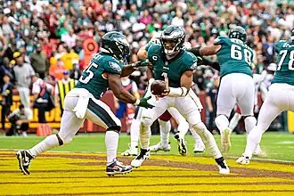 The Eagles put up 363 rushing yards against Green Bay, with both Jalen Hurts and Miles Sanders rushing for over 100 yards each. While the Eagles defense gave up 33 points to the Packers, they intercepted Aaron Rodgers twice. Rodgers exited the game in the third quarter due to an injury and was replaced by Jordan Love, who threw a 63-yard touchdown to rookie wide receiver Christian Watson. The Eagles would clinch the victory with a 54-yard field goal from Jake Elliott. With the win, the Eagles improved to 10–1 (their first double digit win season since 2017) and maintained their lead in the NFC.