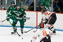 The team recovered a bit at the very end of the season, with Croteau backstopping them to a 3-game winning streak as the conference tournament began. After a relatively easy victory over St. Lawrence in the first round, the defense came up big in the first game with Union. After twice getting behind by a goal, the Big Green raised their level of play, holding the Chargers to just 10 shots over the final 40 minutes. The offense was the story in the rematch with Dartmouth exploding for 7 goals with contributions from up and down the lineup. The minor upset sent the team to the semifinals where Clarke was getting his first start in over a month. Perhaps due to inaction, the netminder was not up to the task and allowed 3 goals on just 14 shots. Dartmouth's offense did him no favors, scoring their only goal with less than 5 minutes left in regulation and the Big Green's season was over.[3] Even with the mildly disappointing finish, Dartmouth still was able to produce its best season in over a decade and made consecutive semifinal appearances for the first time since 1980.[4]