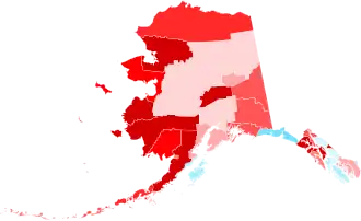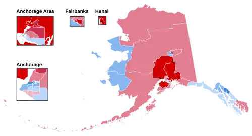 Unlike every other U.S. state, Alaska is not divided into counties or parishes. Rather, it is administratively divided into 20 boroughs: 19 organized and 1 unorganized, which act as county equivalents. The Unorganized Borough lacks a borough government structure and itself is divided into eleven census areas.[31] Contrary to election results in most states, official results by borough are not available – rather, they are estimates based on precinct-level data.[32] However, the Alaska Division of Elections does release official results by State House district, which are listed in the table below. Trump won 24 districts to Harris's 16.