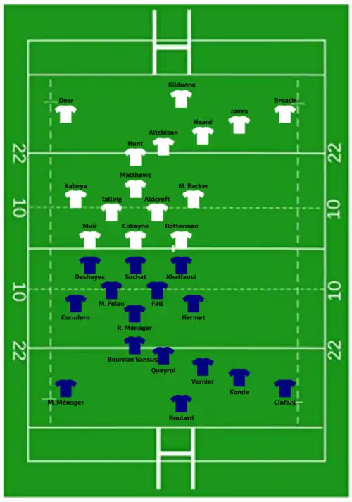 | Try: Sansus 3' c M. Ménager 32' c Fall Raclot 47' c Sochat 62' c Riffonneau 75' c Con: Queyroi (4/4) 4', 34', 49', 63' Bourgeois (1/1) 77' Pen: Queyroi (1/1) 38' | Report | Try: Wafer 71' c Dalton 78' c Con: O'Brien (2/2) 72', 77' Pen: Fowley (1/1) 14' |