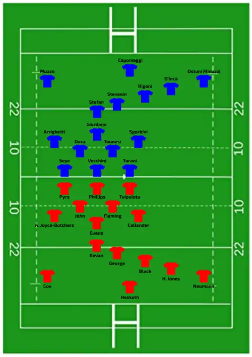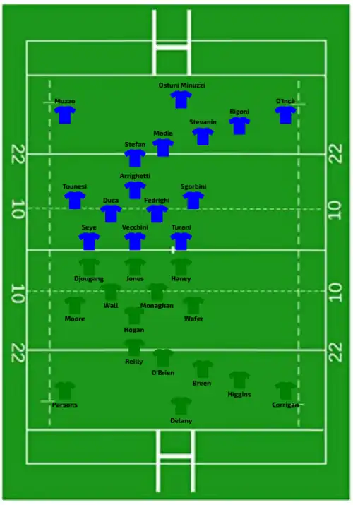 | Try: Penalty try 8' Jones 62' c Corrigan 79' c Con: O'Brien (2/2) 63', 79' | Report | Try: Vecchini (2) 25' m, 57' c Fedrighi 33' c Muzzo 69' m Con: Rigoni (2/4) 34', 58' Pen: Rigoni (1/1) 36' |