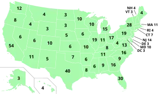 The United States Electoral College is the group of presidential electors required by the Article Two of the Constitution to form every four years for the sole purpose of electing the president and vice president. Each state appoints electors according to its legislature, equal in number to its congressional delegation (senators and representatives). Federal office holders cannot be electors. Of the current 538 electors, an absolute majority of 270 or more electoral votes is required to elect the president and vice president.[1] As stated in the Twelfth Amendment to the United States Constitution, if no candidate for either office achieves an absolute majority there, a contingent election is held by the United States House of Representatives to elect the president, and by the United States Senate to elect the vice president; under this amendment, only the election of 1824 failed to produce a majority for president, and the election of 1836 for vice president.