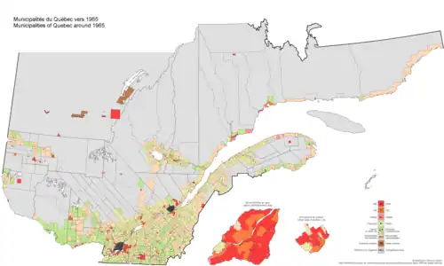 The municipal history of Quebec started in 1796 with the creation of administrations for Montréal and Quebec City, but was abolished and replaced in September 1847 by a system of county municipalities, whose councillors were elected from the parishes and townships existing therein,[1] with provision for the creation of towns and villages that would be separated from their counties.[2] Further reform came into effect in July 1855[3] for all parts of Lower Canada other than Montreal, Quebec City and Saint-Hyacinthe,[4] which included provision for the creation of local councils for parishes and townships,[5] the representation of towns and villages on county councils,[6] and the formation of towns and villages by order in council upon the recommendation of the relevant county council.[7] The municipal law of Lower Canada was consolidated into a single Act in 1860.[8]
