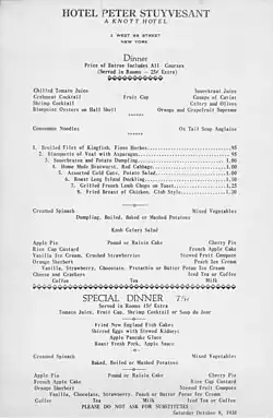- ^ A 1935 map of the Knott Hotels lists the Hotel Peter Stuyvesant at Central Park West at 86th Street. The hotel advertises that all rooms have baths, single rooms charges $4 per night and double rooms charge $6 per night.