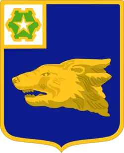 - Shield: Azure, the head of a wolverine erased Or; on a canton Argent a six-bastioned fort Vert charged with a mullet of the third (for the 36th Infantry).