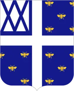 Azure, semé of bees Or, a cross Argent, on a canton of the last two saltires of the field.