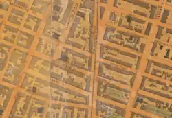 In the first decades of the 19th century, real estate speculators bought up the vacant lots that had been laid out on the grid established by the state-appointed Commissioners' Plan of 1811 and there followed a building boom that was characterized by one historian as a mania of construction.[14] During this boom, fine townhouses were erected on the Broadway end of Great Jones Street, including one, at the corner, described by its owner, former mayor Philip Hone, as "a most delightful and comfortable residence".[15] In 1845, a physician named Benjamin Bailey bought up land on the southwest corner of the other end of the street and built a house on the part of it that faced the Bowery.[16][17] In advertising the land Bailey bought, a real estate agent gave the plot's dimensions: was 26 feet, four inches wide on the Bowery side, 100 feet long on the Great Jones Street side, 25 feet wide at the back, and 107 feet 10 inches long on its south side.[18] In 1847 Bailey added to this holding by buying a square piece of land measuring about 25 by 25 feet at the southwest corner of the parcel.[16] A property map published in 1852 shows the configuration of the lot on which Bailey built the house and the two pieces of land that lay behind it. Designated as Lot 132 in Block 530 and together measuring about 25 feet wide and 50 feet deep, these two pieces of land, one lying behind 346 Bowery and the other lying behind 344 Bowery, became 57 Great Jones Street.[19][20]