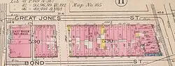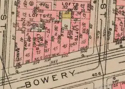 A real estate transaction of 1888 showed that a plot of land located at the back of 57 Great Jones Street and the back of 342 Bowery had by then been added to Lot 132.[21] Measuring about 25 by 25 feet, this addition to the lot appears in a fire insurance map of 1891. The map mislabels the address of the lot as 53 rather than 57 Great Jones Street, and it treats 57 Great Jones Street and 456 Bowery as if they were the same building. It shows Lot 132 to have three brick buildings, the one facing Great Jones Street and two behind it.[22] Fire insurance maps made in 1893 and 1897 give the same information except that in 1893 there is only one building behind the building that faced 57 Great Jones Street (a wood-frame structure) and in 1897 there is a brick building in that location and a frame building behind it.[23][24] A fire insurance map of 1911 is similar to the 1893 and 1897 maps. It treats 57 Great Jones Street and 346 Bowery as if they were the same building, but it does give the correct house number to 57 Great Jones Street.[25]