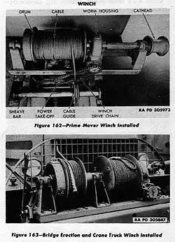 Prime movers had a 25,000 lb (11,000 kg) winch behind the cab, most other trucks had a front-mounted two-drum winch for self-recovery. Trucks converted from prime mover chassis had no winch at all.[11]
