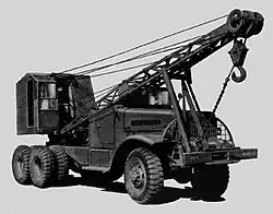 Quickway cranes were used by combat engineers to unload and assemble bridge components. The rotating crane was powered by an auxiliary IHC 334 cu in (5.5 L) inline 4 cylinder engine developing 35 hp (26 kW). As a derrick it could lift 13,000 lb (5,900 kg) at a minimum radius of 10 ft (3.05 m) and 5,550 lb (2,520 kg) at a maximum radius of 25 ft (7.62 m). A shovel, clamshell, dragline, and drilling equipment could also be used. The cab had a windshield on the left side only, in transit the boom went over the right side and was braced to the front bumper. A 25,000 lb (11,000 kg) winch was mounted on the front. Brockway built 1,224.[6][17]